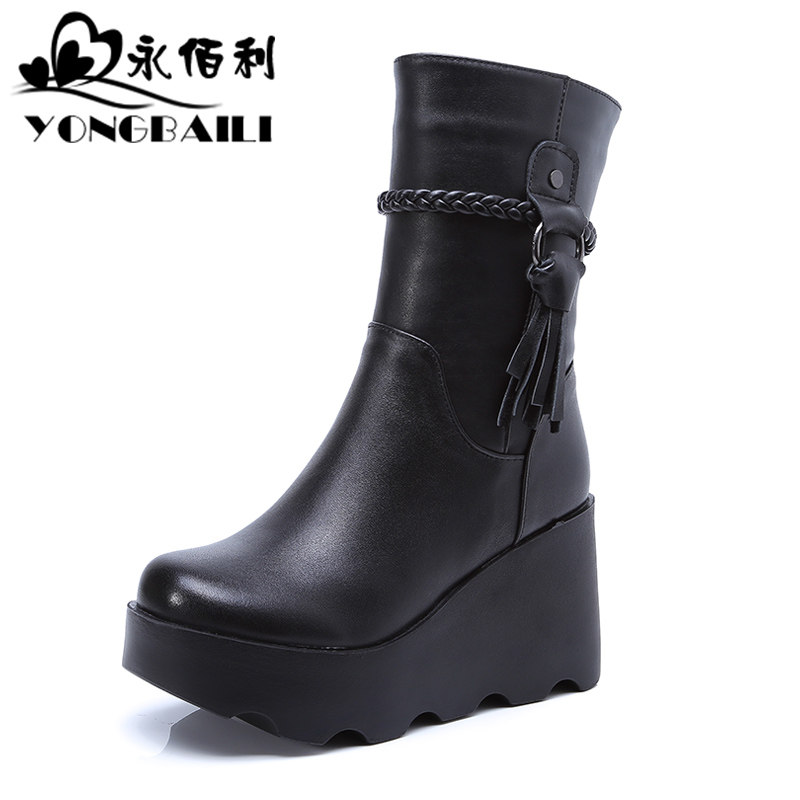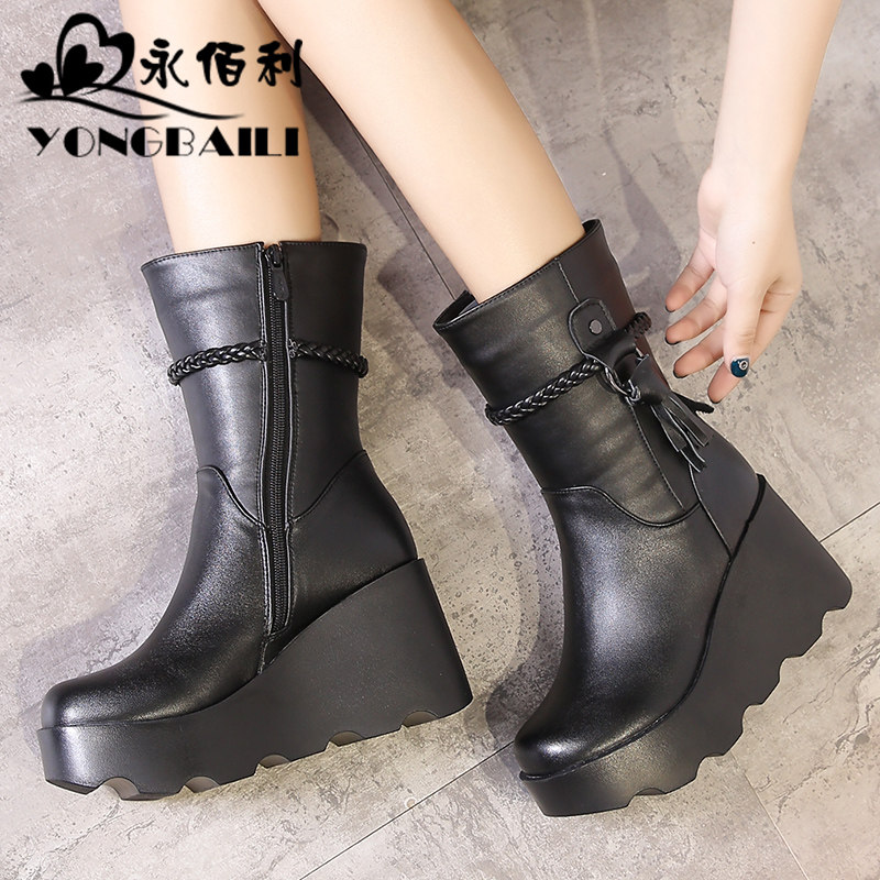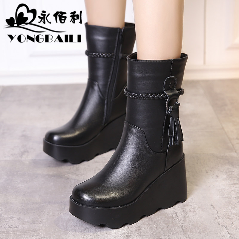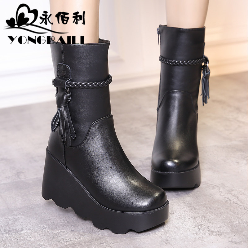 真皮中筒靴2025冬新款牛皮坡高跟女靴圆头厚底休闲马丁靴女鞋皮靴 - 永佰利鞋类旗舰店