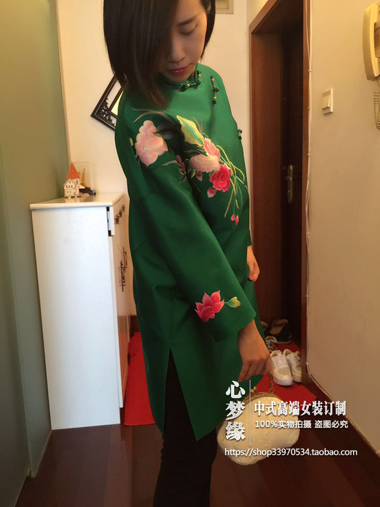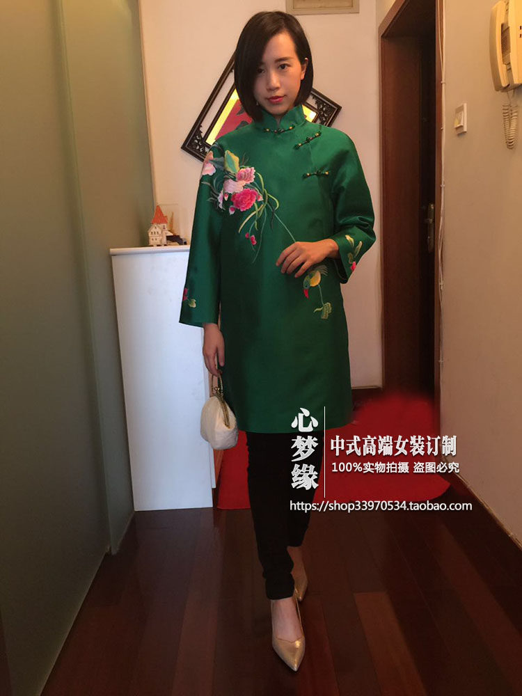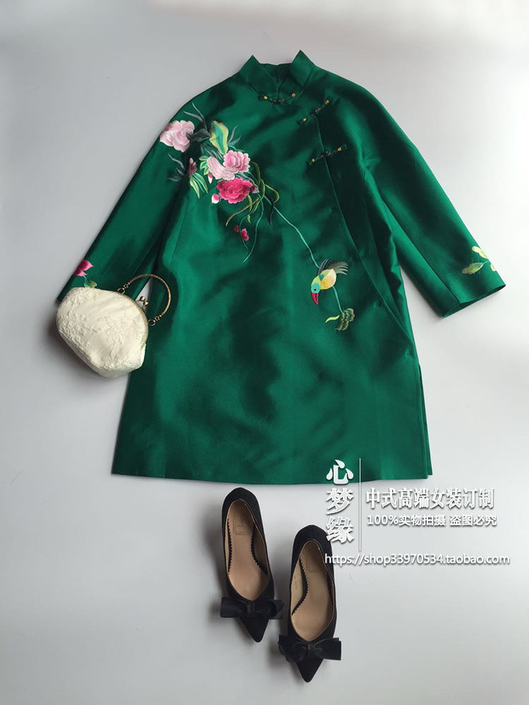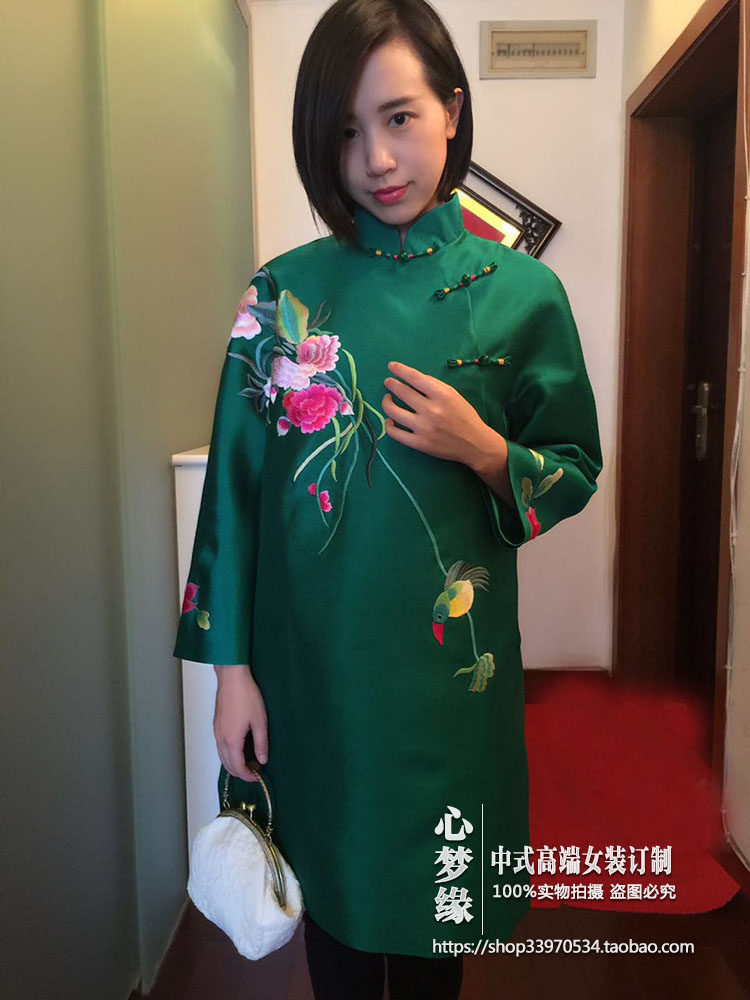 早秋新品 中式真丝丝毛斜襟玉扣喜鹊绣花中长款改良旗袍连衣裙 - 心梦缘中式女装订制