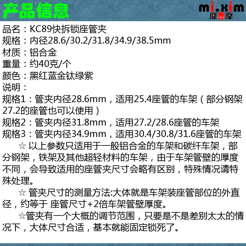 mixim 27.2/30.8/31.6座杆用内径28.6/31.8/34.9座管夹快拆座杆夹 - 华隆兴单车
