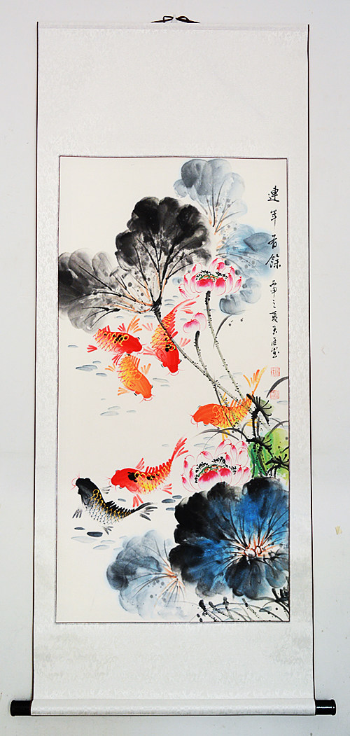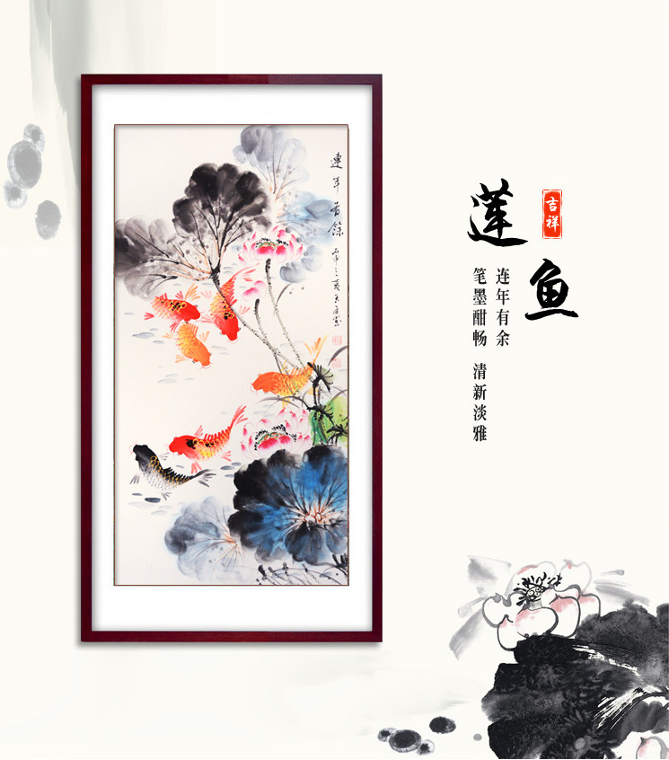 纯手绘九鱼图连年有余花鸟国画真迹竖版入户玄关装饰挂画水墨画 - 印传承字画装裱镜框相框