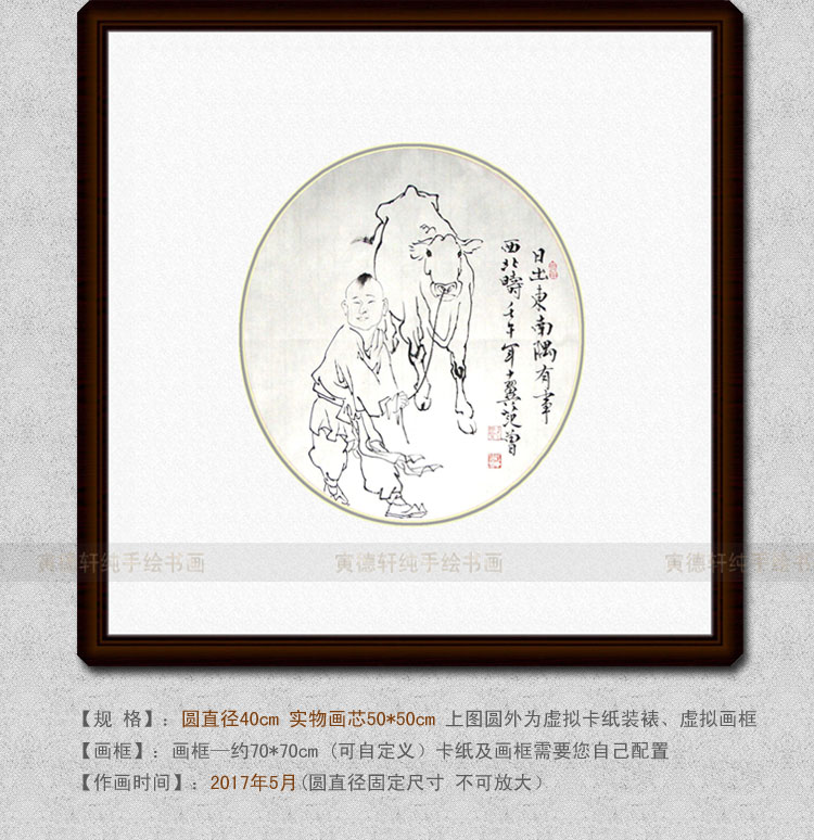 纯手绘国画名人字画仿范曾40cm圆形斗方白描日出东南隅小孩牵牛图 - 寅德轩书画手绘