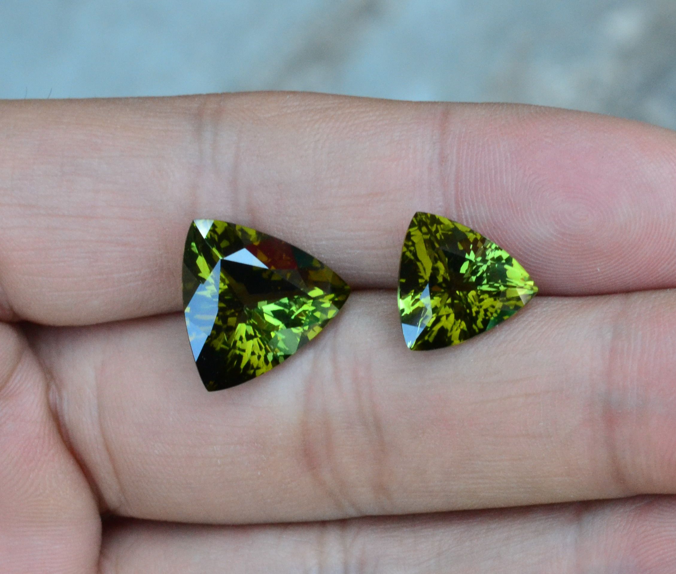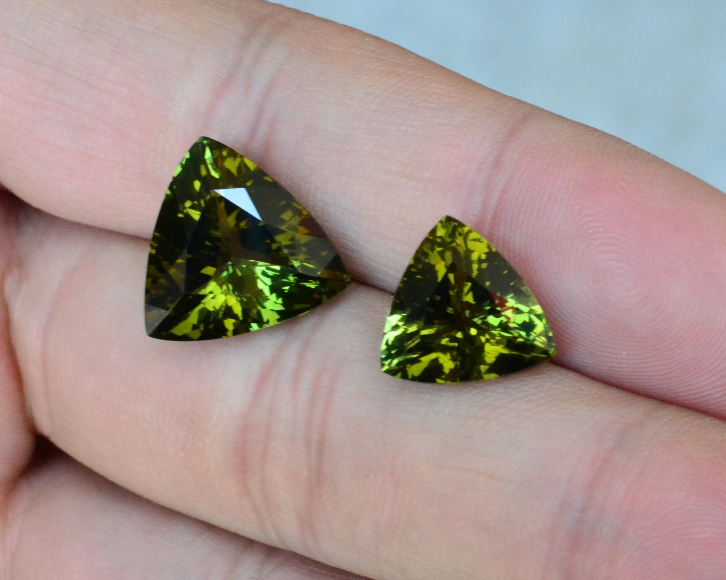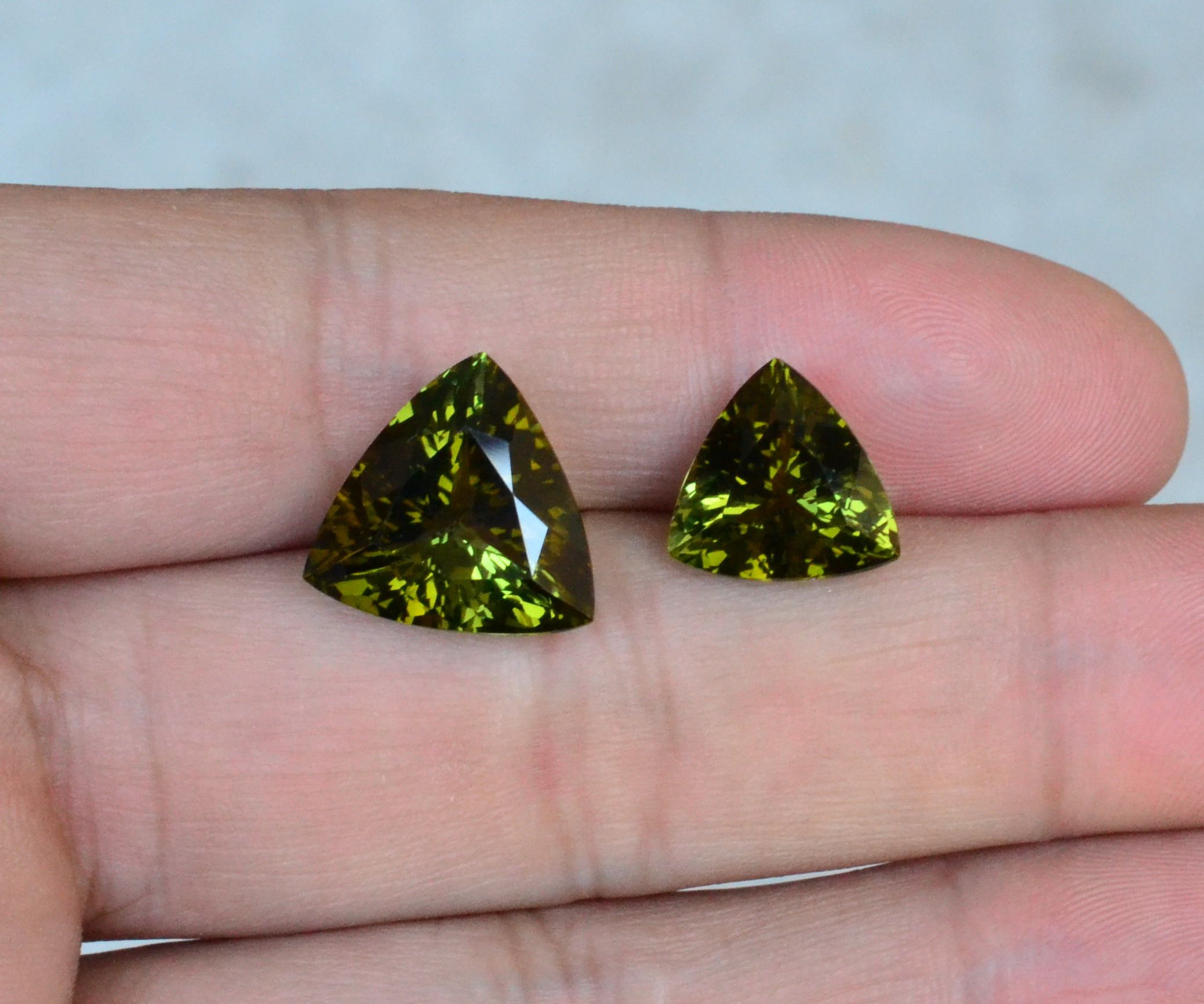 大克拉天然绿碧玺裸石三角形戒面母子对fl全净体满火彩包邮送证书