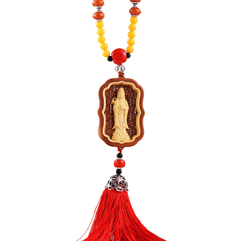 黄杨木雕观音菩萨汽车挂件高档大气镂空枣木观音车内后视镜挂饰品 - 香车名家车饰品店