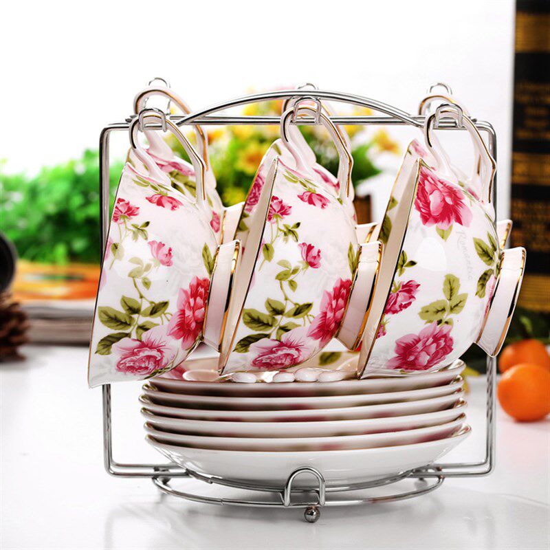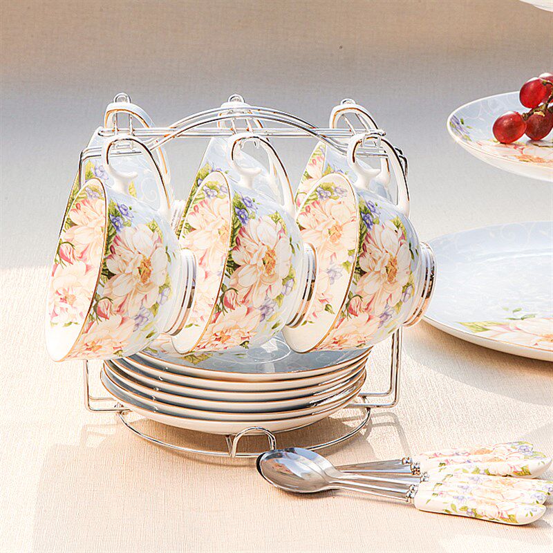 欧式花茶陶瓷咖啡杯套装英式骨瓷创意6件套骨瓷咖啡杯碟勺带架子 - 芦短芽商城的小店
