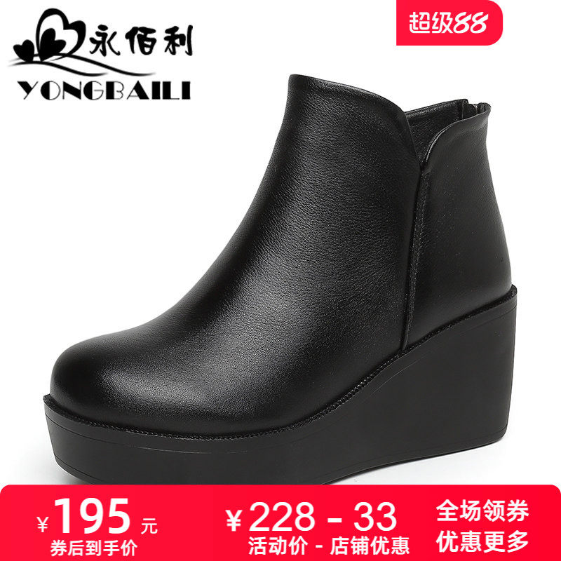 秋冬新款小众牛皮短靴女圆头休闲女靴厚底松糕底坡跟女单靴子高跟 - 永佰利鞋类旗舰店