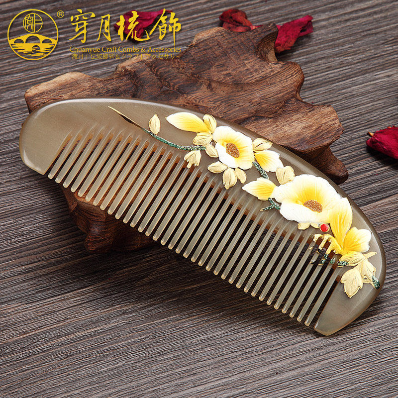 穿月漆艺花羊角牛角梳子刻字礼品礼盒牛角梳篦开裂静电 - 说和雨商城的小店88