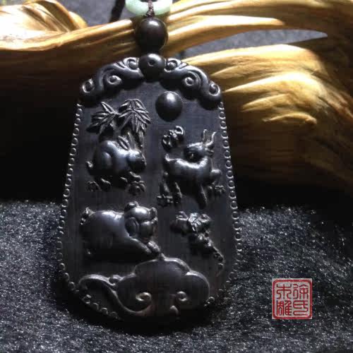 紫光檀猪兔羊三合局牌子 黑檀木三合生肖挂坠吊坠项链 红木木雕 - 徐氏木雕原创檀木工艺礼品店