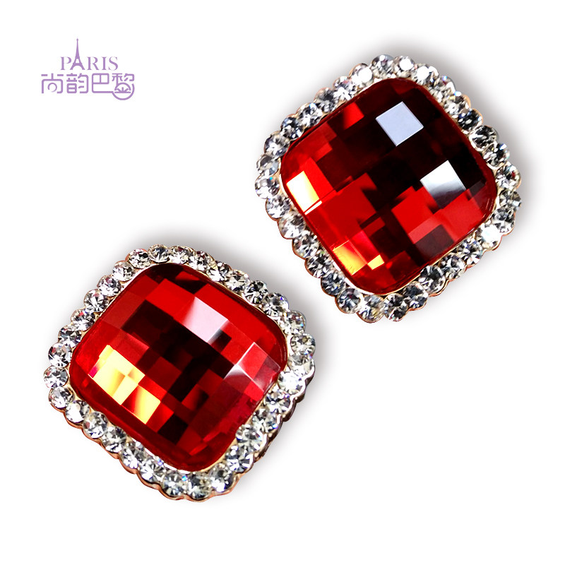 欧美时尚名媛大气方形红蓝宝石大耳钉新娘结婚耳扣黑色无耳洞耳夹 - 尚韵巴黎钻饰