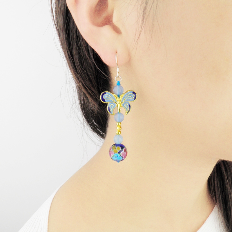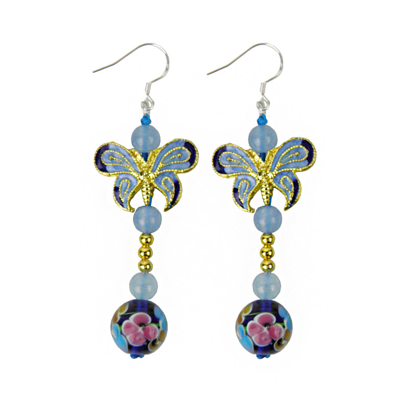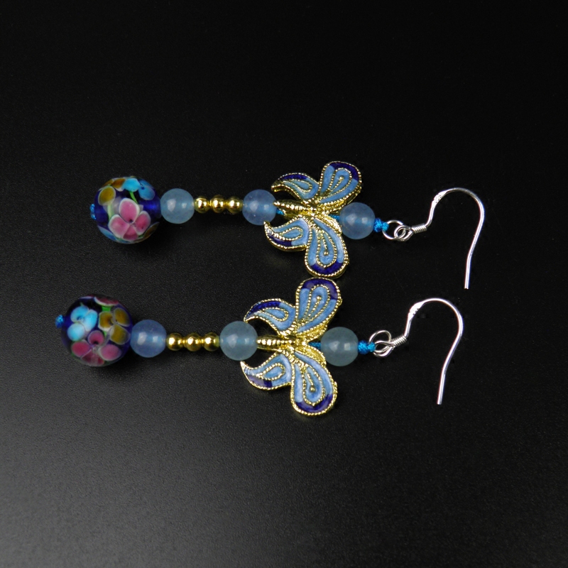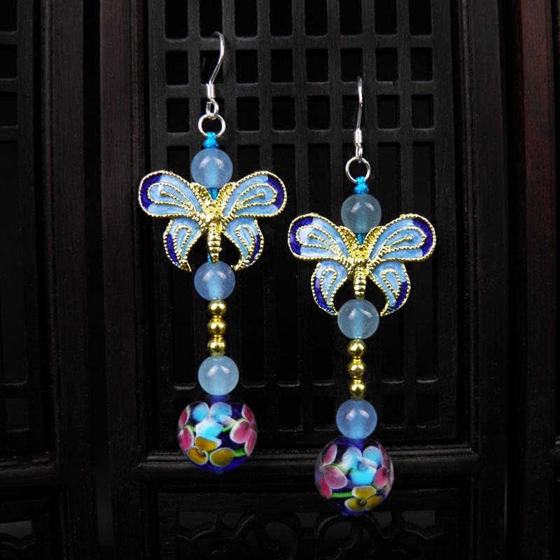 中国风景泰蓝蝴蝶耳坠立体动物长款气质耳环女复古民族风纯银耳饰 - 在水一方原创饰品