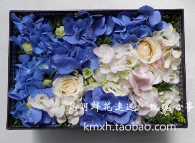 昆明花店鲜花速递昆明-桔梗-玫瑰-双色绣球长方盒装花 - 昆明鲜花速递玫瑰心事