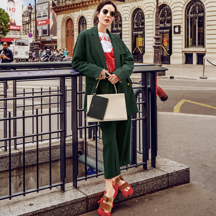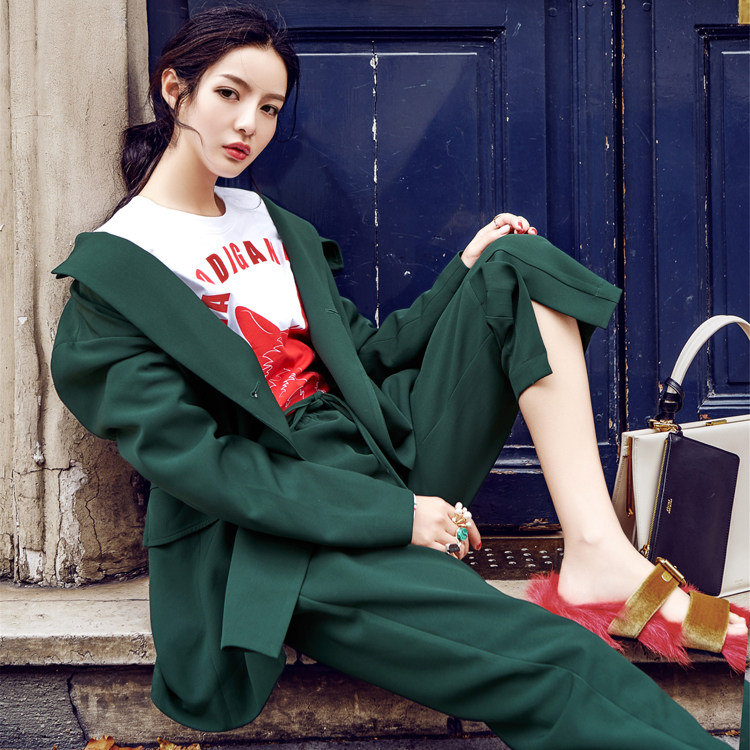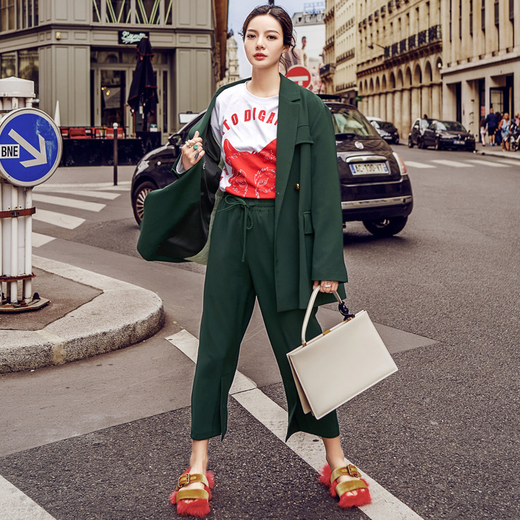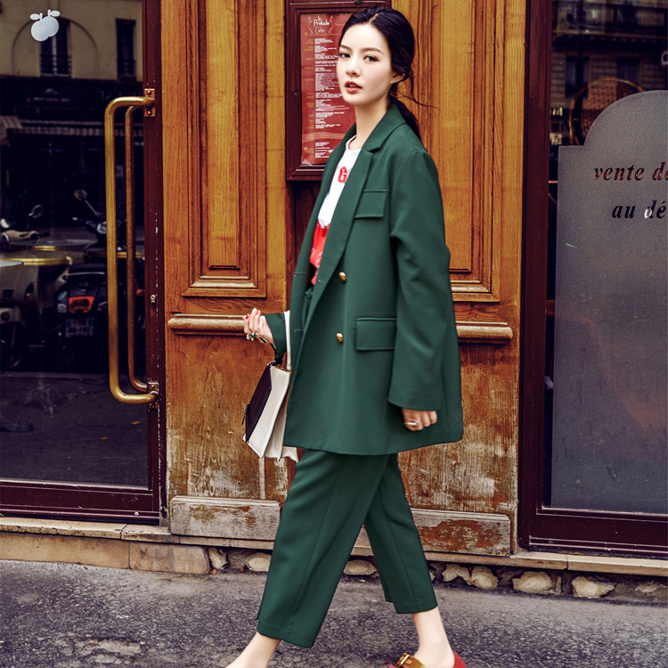 春秋新品设计款开叉时尚七分裤宽松廓型双排扣外套绿色西装套装 - DIBO优尚精品女装店
