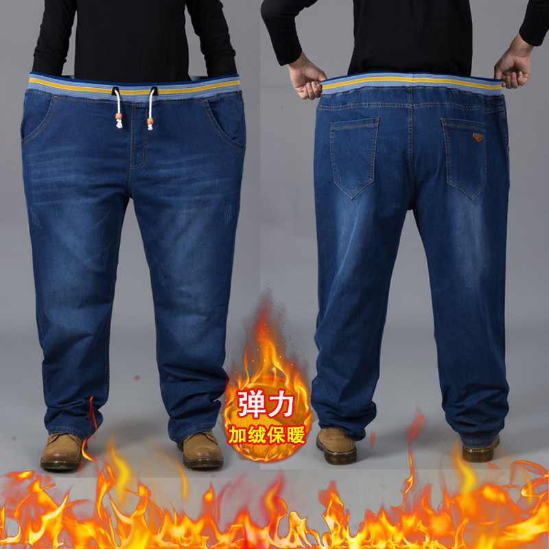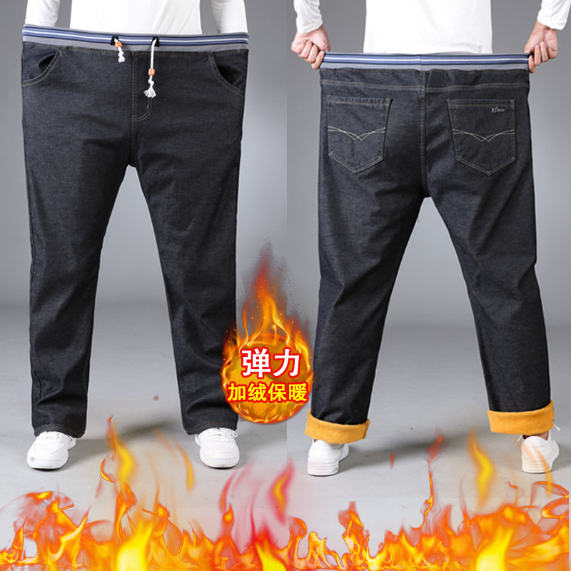 冬季保暖加厚加绒牛仔裤男士宽松紧腰直筒高腰加肥加大码弹力胖子