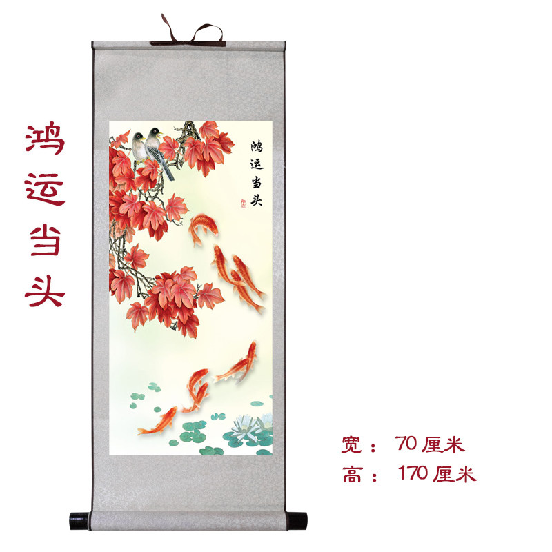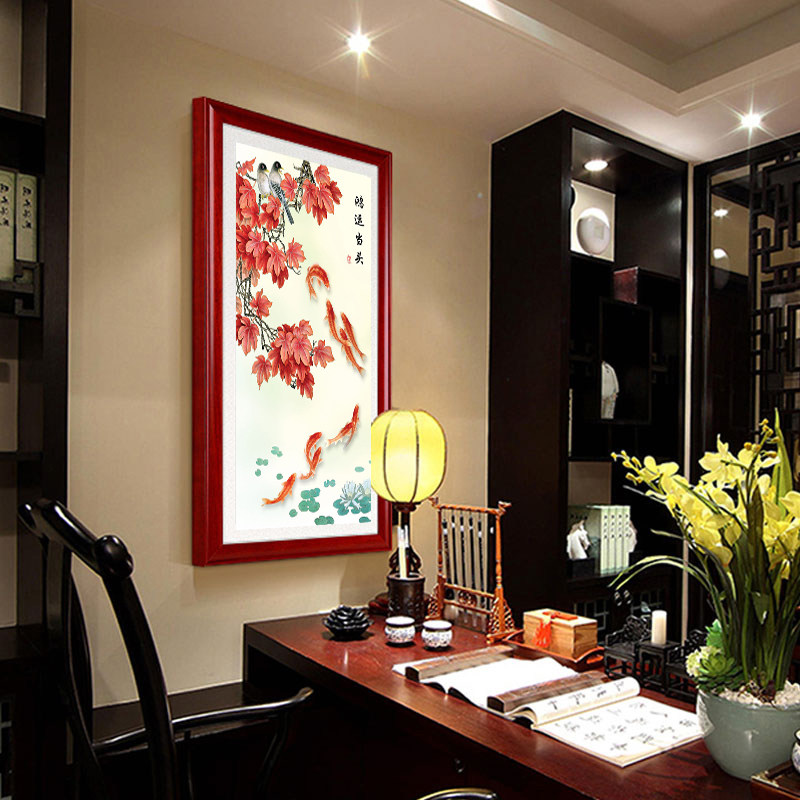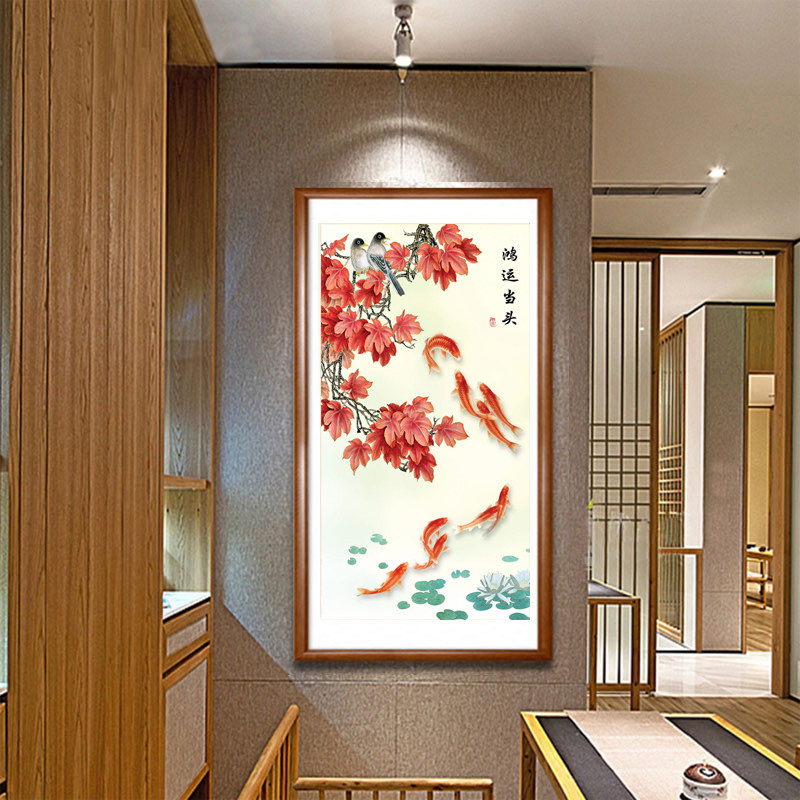 现代中式竖版玄关装饰画寓意国画走廊挂画九鱼图鸿运当头枫叶挂画 - 丝绸书画工厂